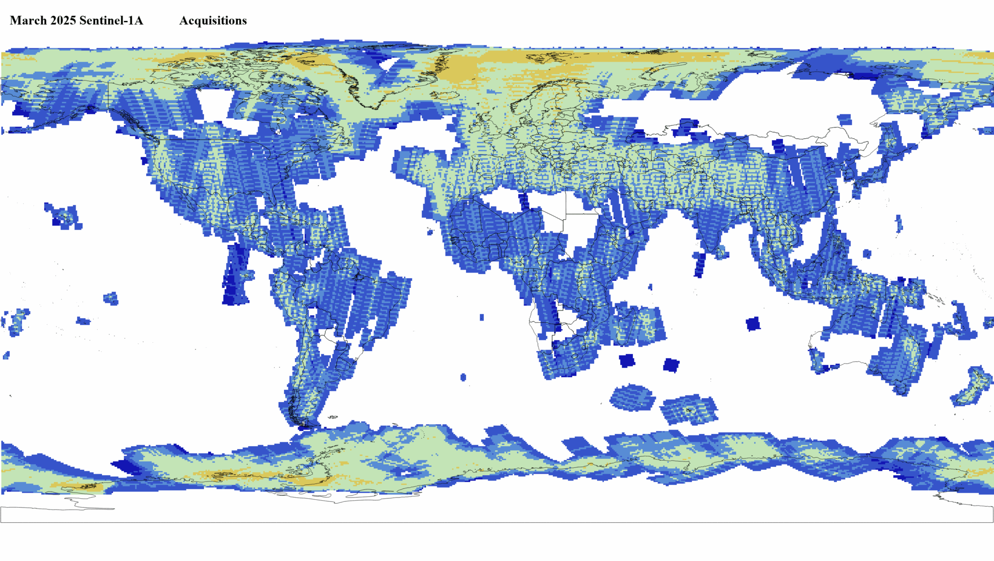 Acquisition maps display the coverage of Sentinel-1 GRD product data over the globe in a given month. There are acquisition maps for as early as December 2014, and maps have been produced monthly up to the current month. A color ramp indicates the number of acquisitions over an area in the specified month.